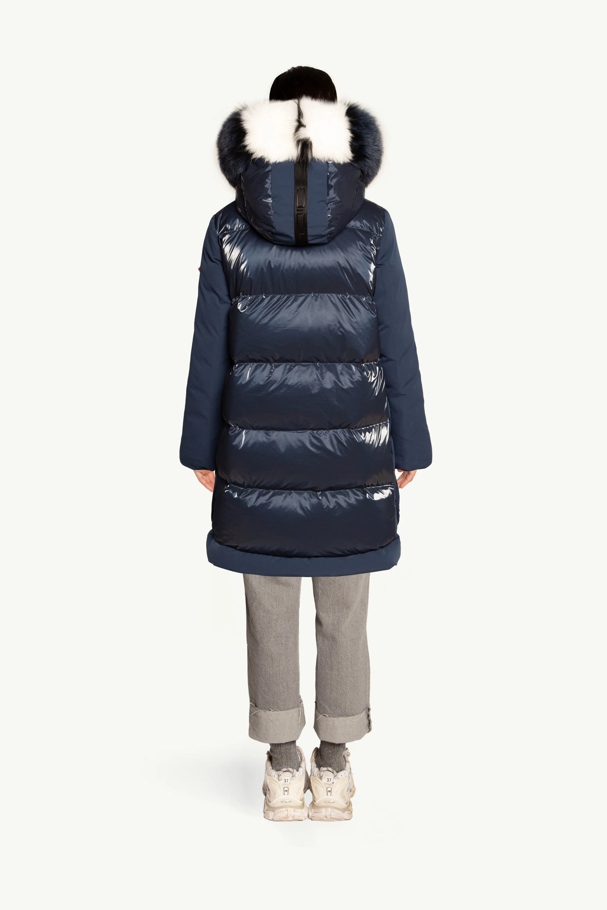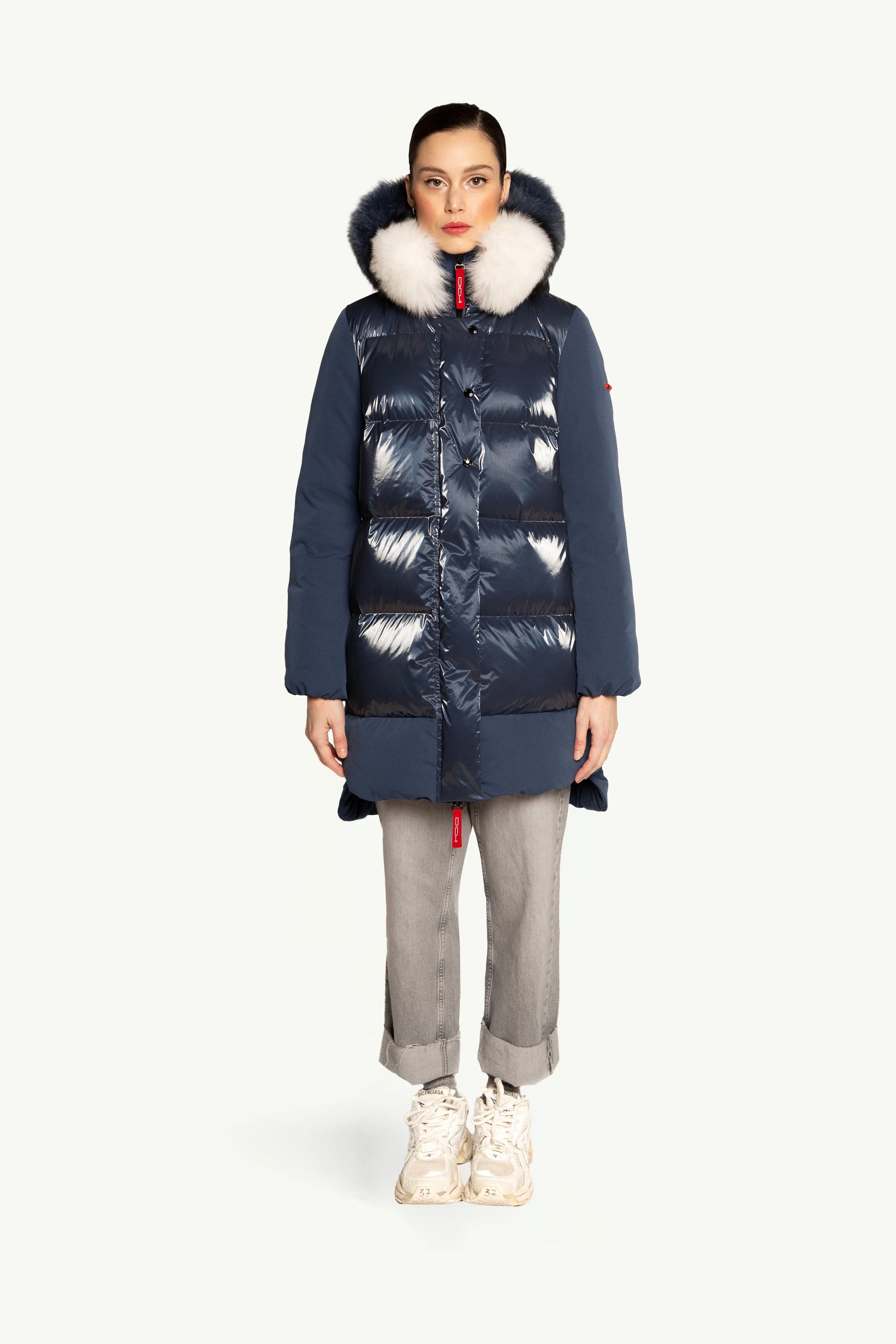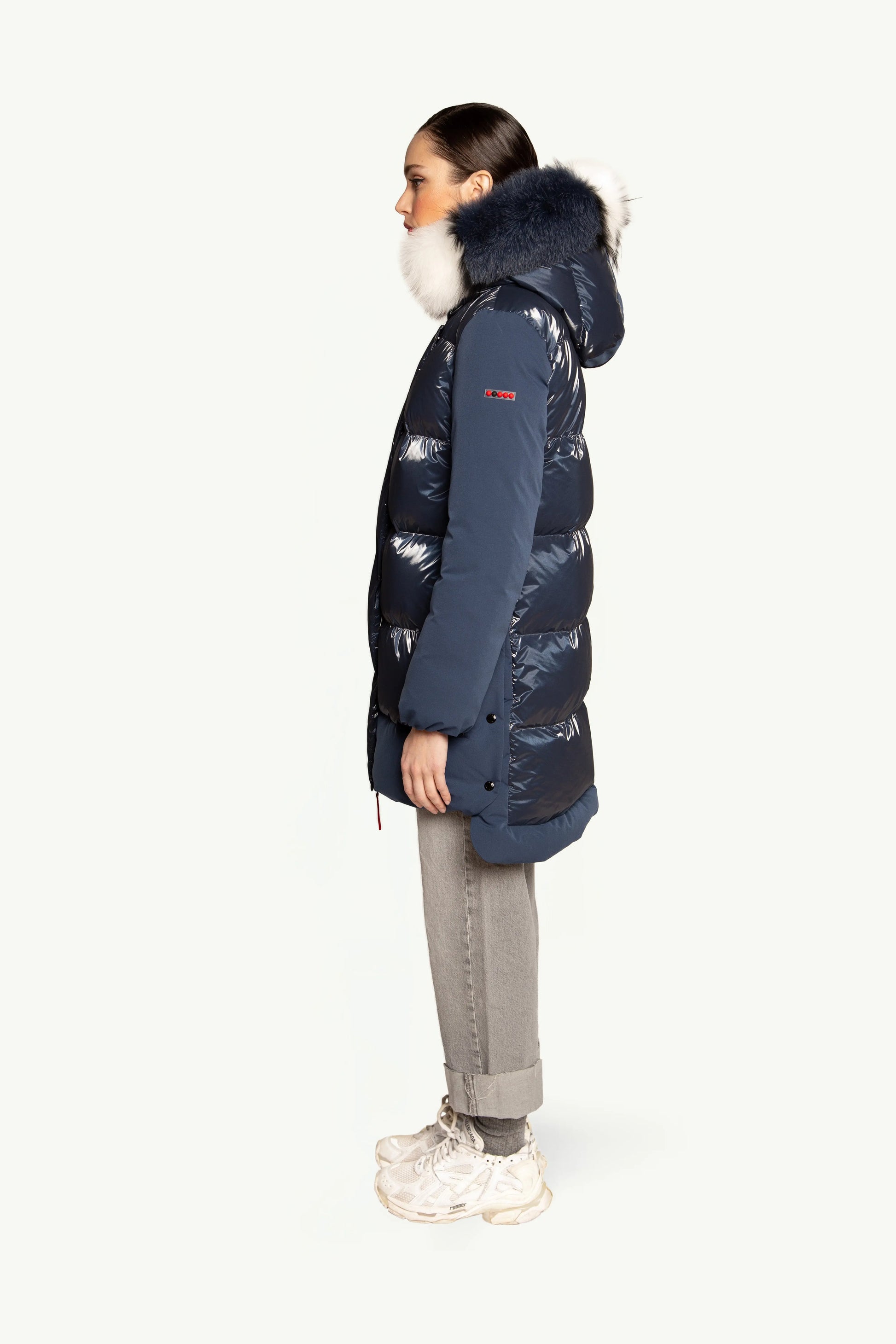 ASHERA plumas que destaca por su combinación única de tejidos con acabado brillante y mate, que aporta un elegante contraste visual. Aperturas laterales con botones. Su capucha está adornada con pelo original a tono, complementada por franjas blancas y negras que realzan su diseño sofisticado. Ideal para quienes buscan una prenda con estilo y personalidad en cada detalle.