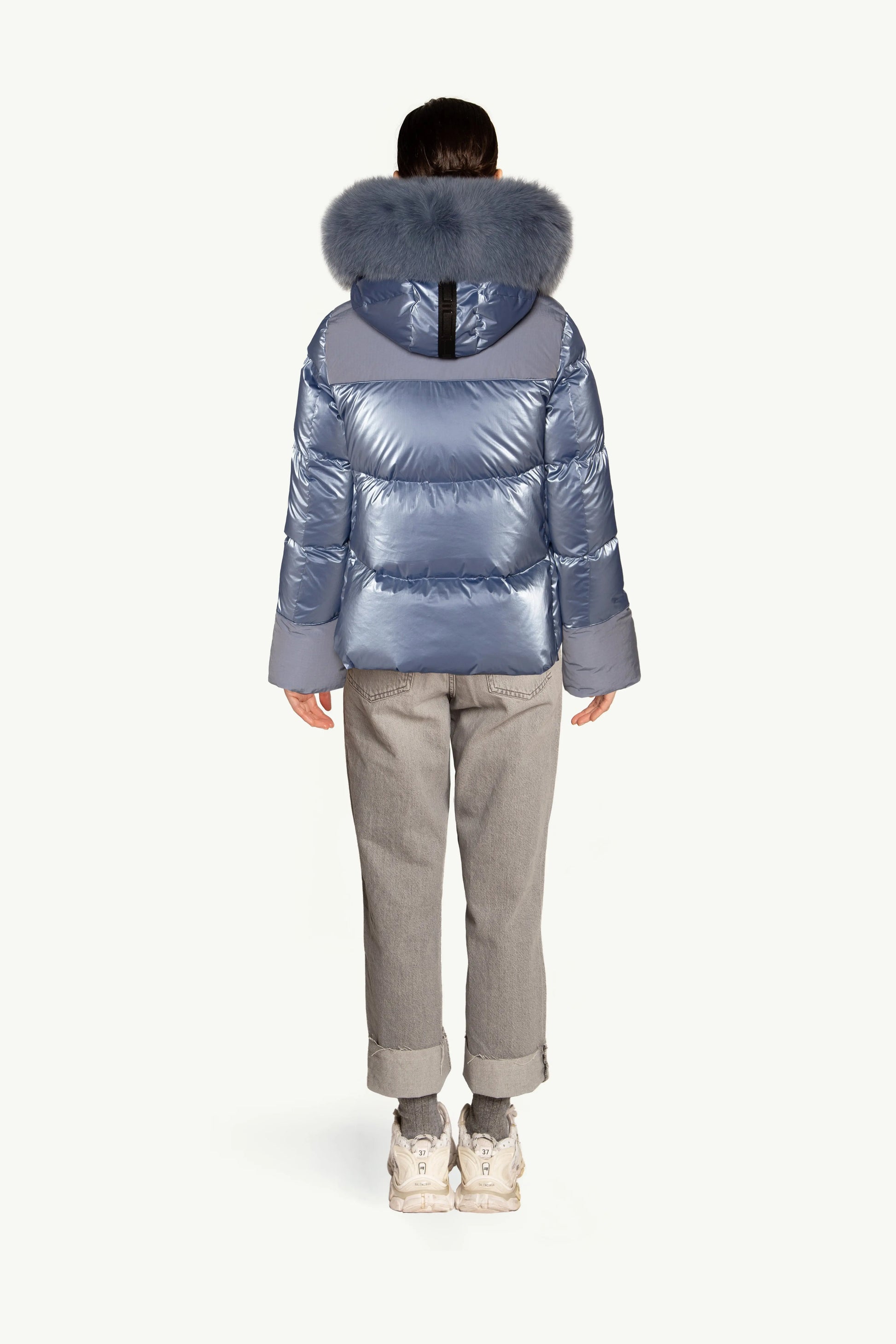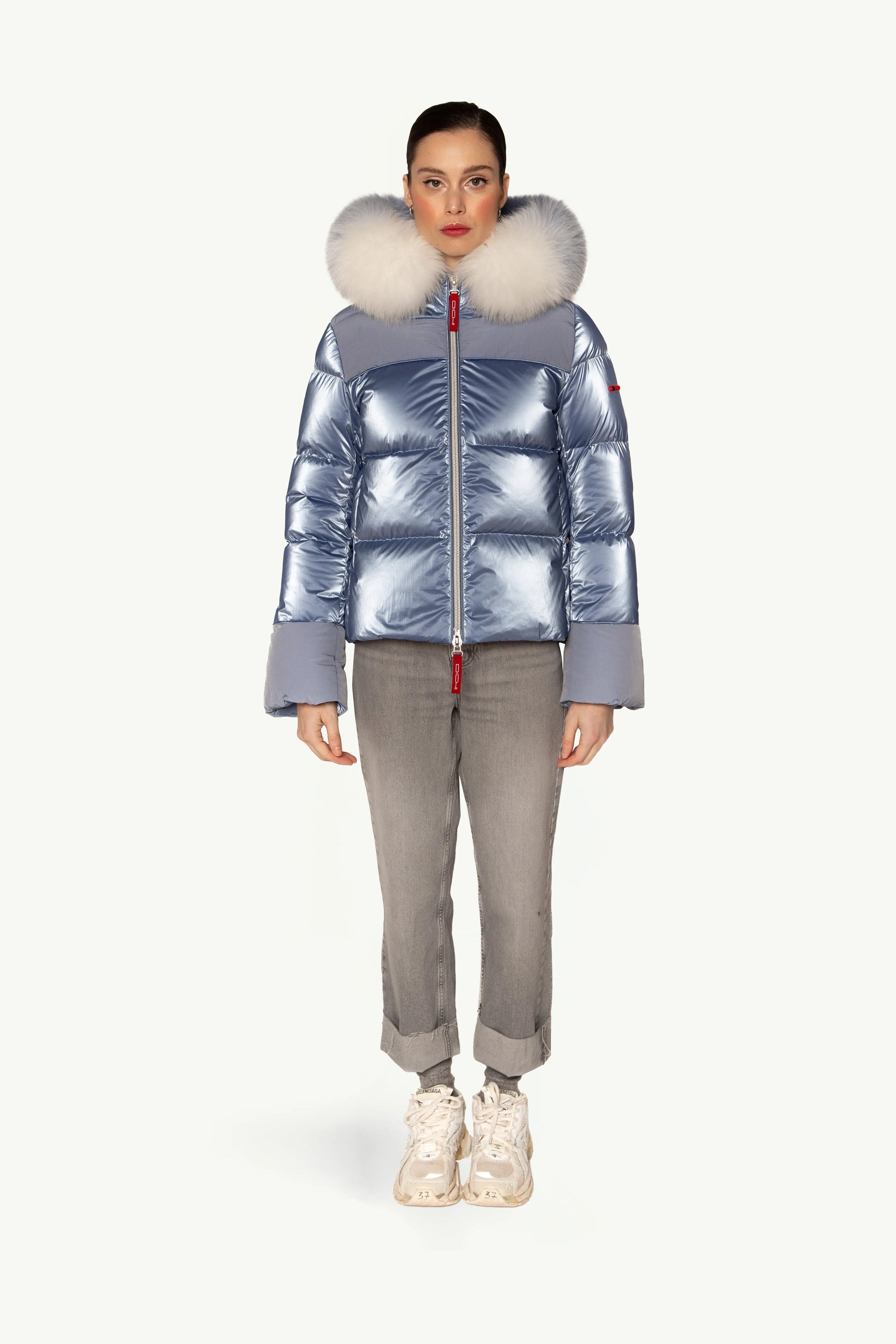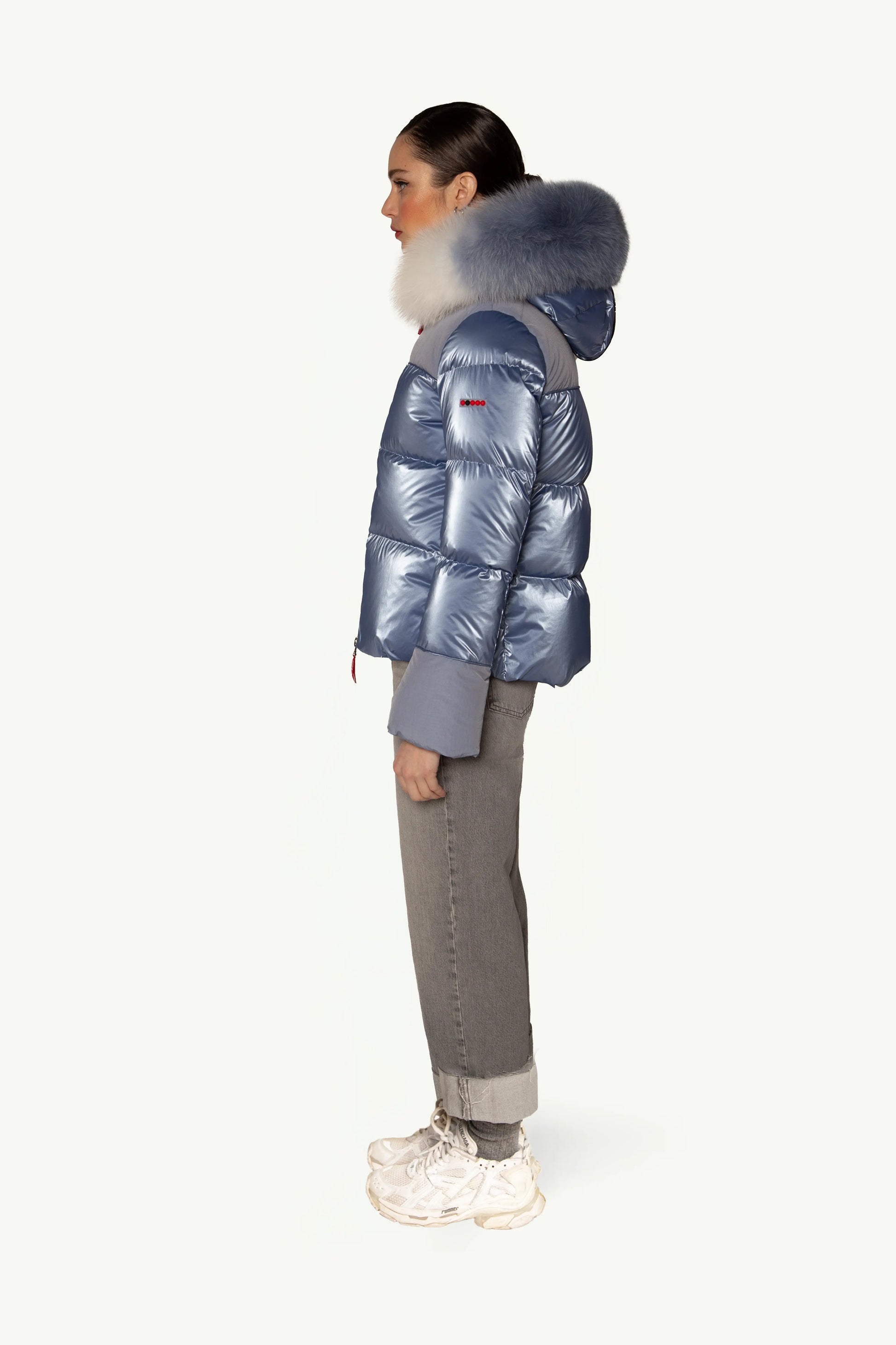 Cazadora, plumas IVON. Combina funcionalidad y estilo con su diseño corto y capucha adornada con un llamativo pelo al tono en degradado y blanco, que aporta un toque sofisticado y moderno. Esta prenda ofrece protección eficaz contra el frío, mientras que su corte favorecedor facilita la movilidad y el ajuste. Perfecta para quienes buscan una capa cálida sin renunciar a la elegancia en sus looks de invierno.