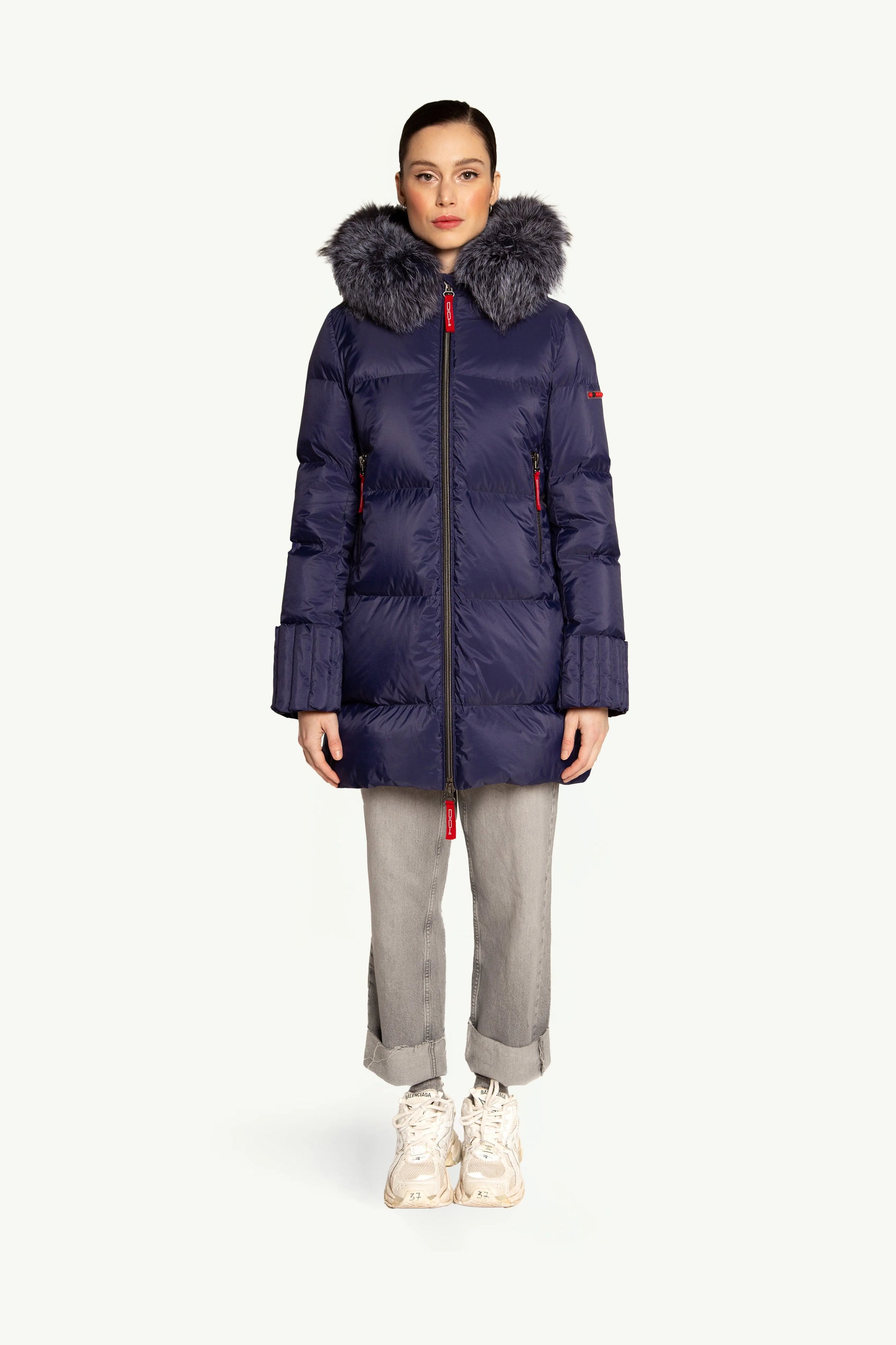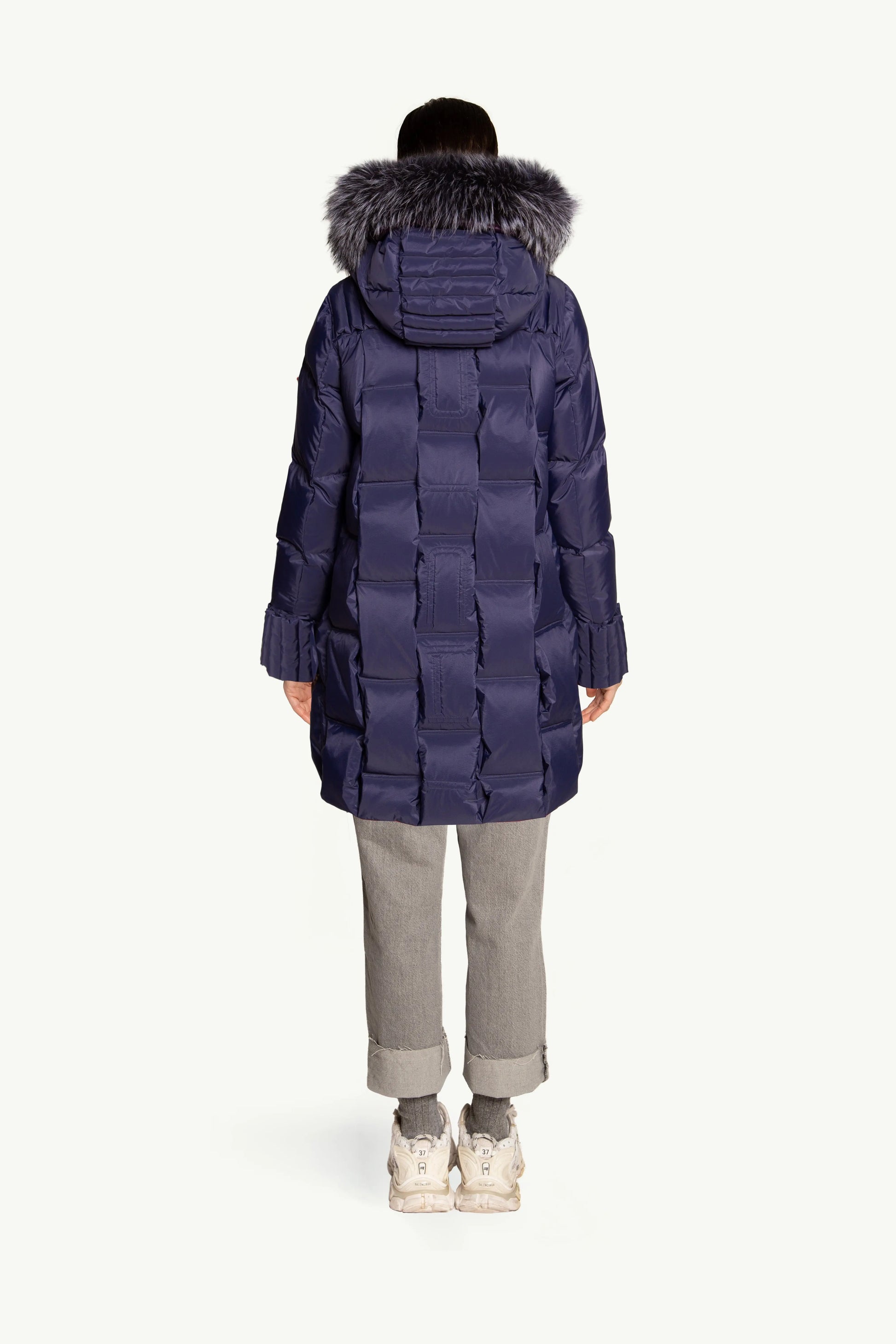 RAILI destaca por su innovador diseño de plumas en la espalda, complementado con una capucha que presenta el mismo diseño adornada con pelo al tono, ofreciendo un look elegante y armonioso.