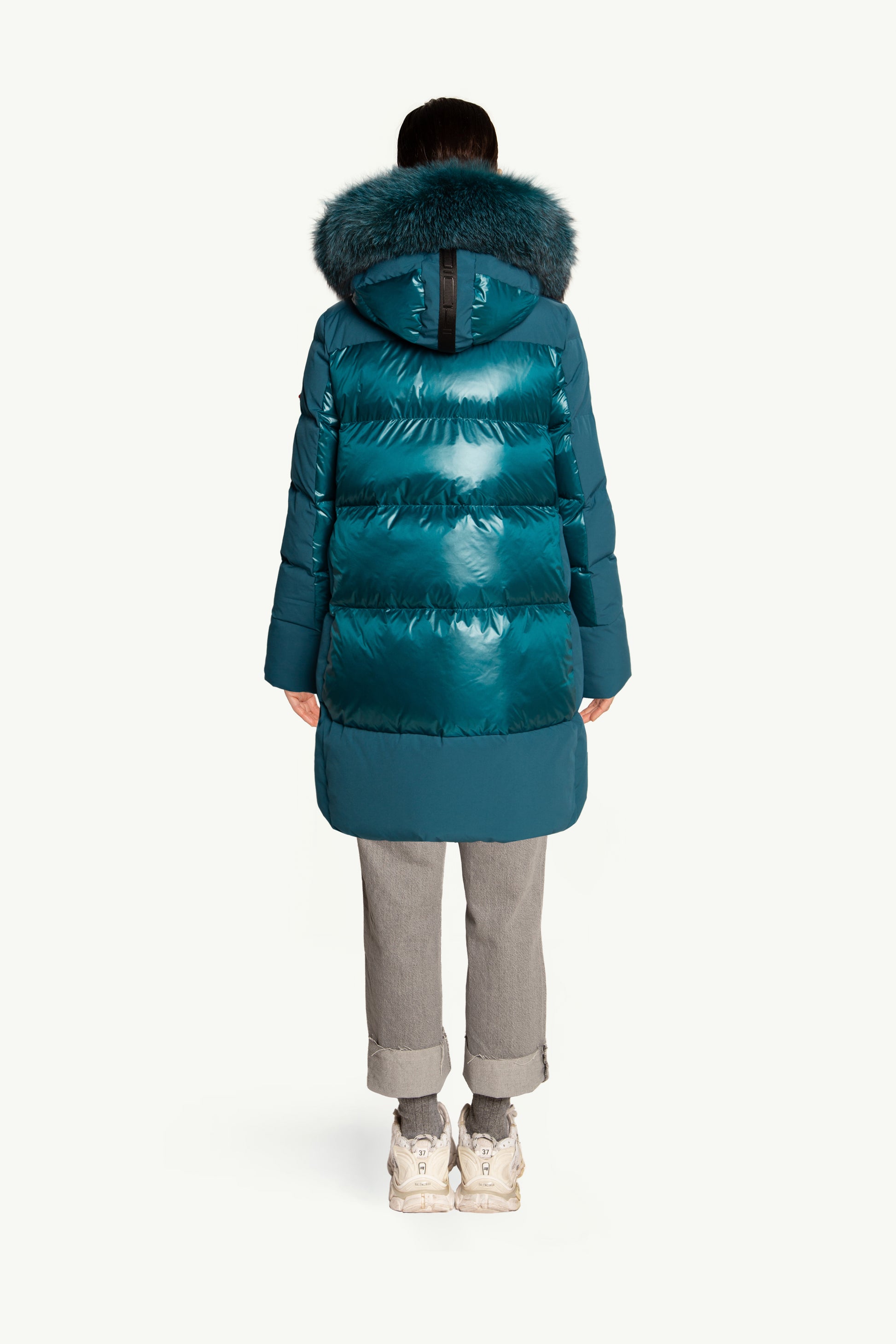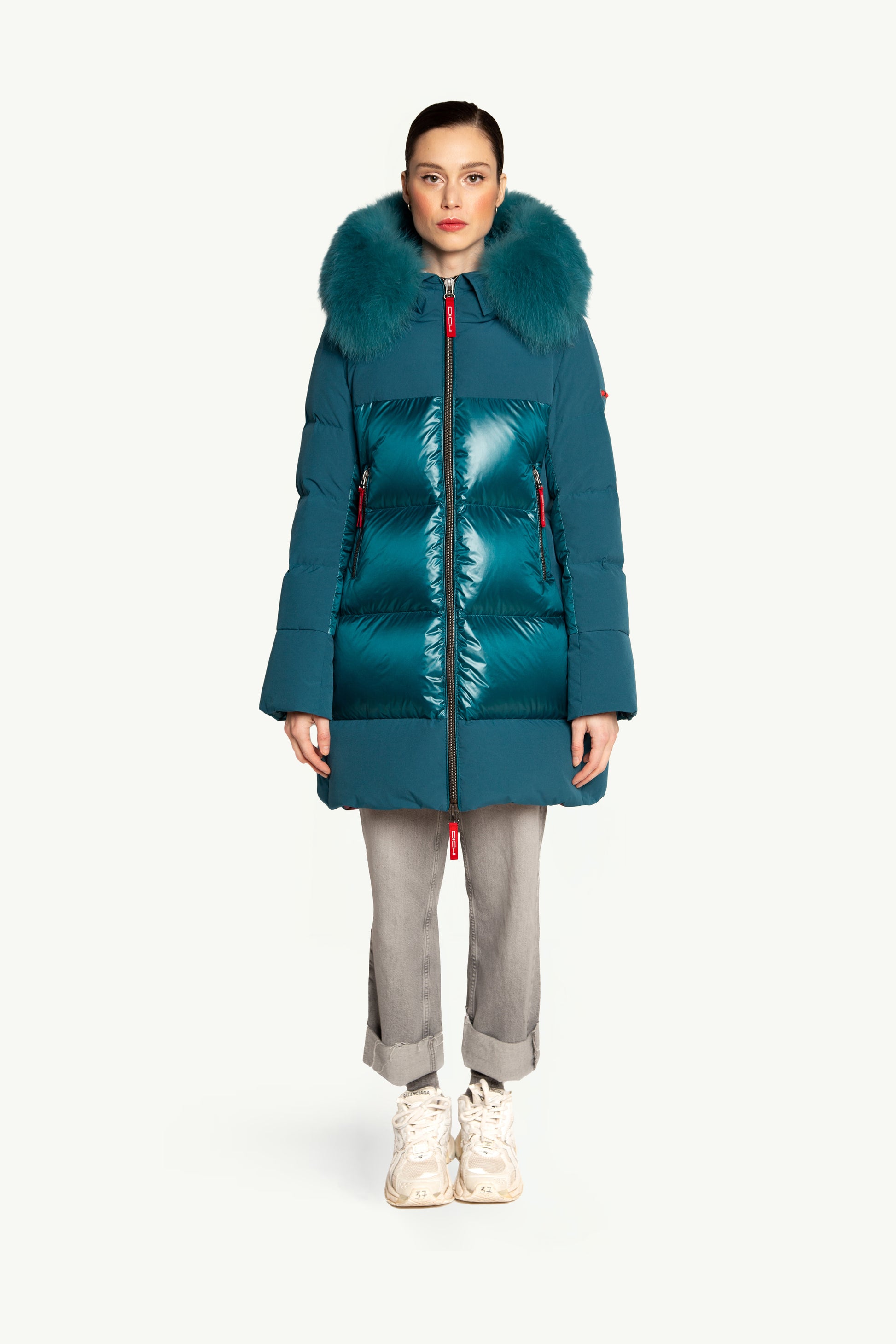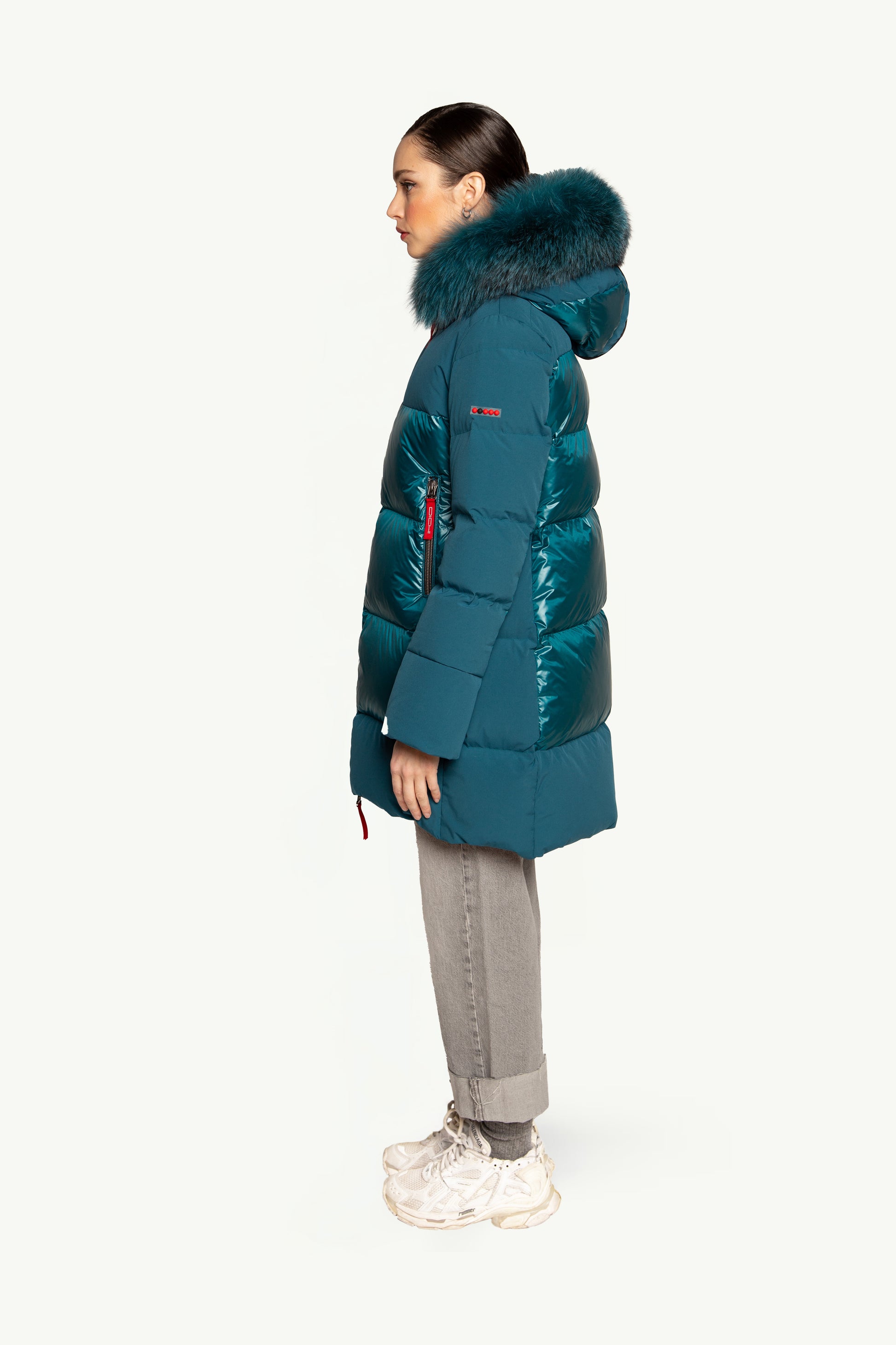 Plumífero STEFFIE con tejido combinado en mate y brillo. Tiene un elegante diseño, con largo por encima de la rodilla. Mangas estilo gabardina. Capucha con un espectacular pelo al tono. Cierre central con cremallera de doble carro.